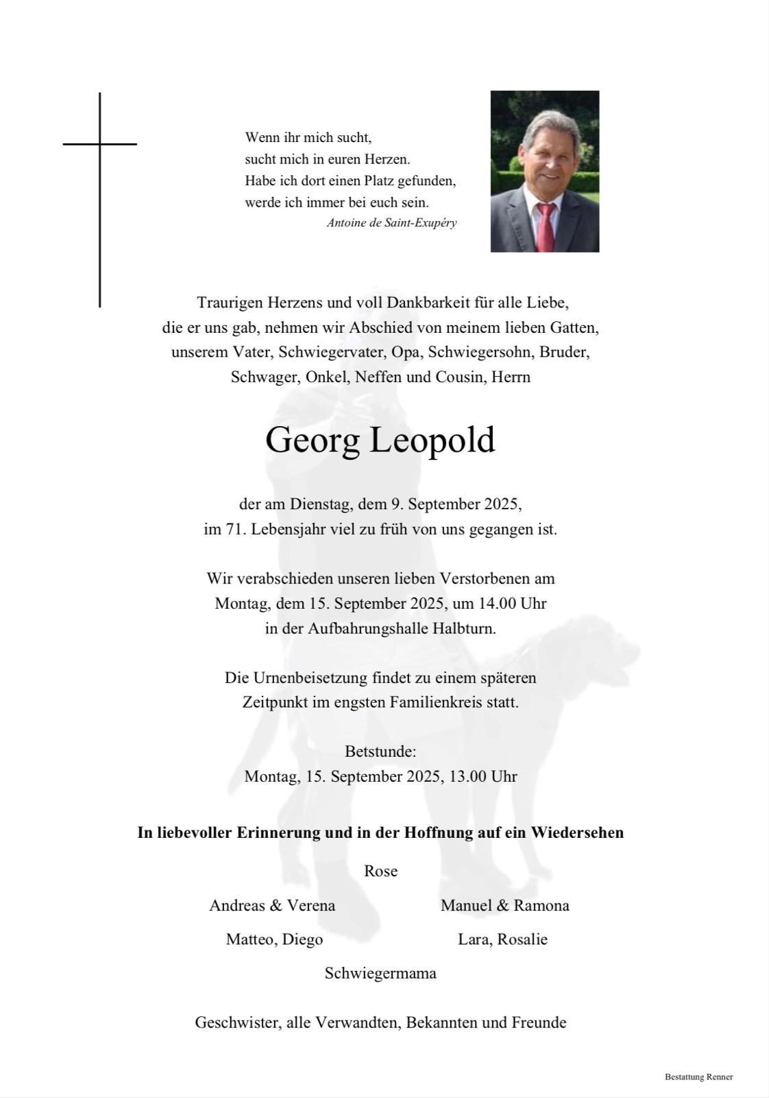 am Samstag, den 15. Februar 2025 findet um 18.00 Uhr ein Gedenkgottesdienst in der Pfarrkirche Halbturn statt.